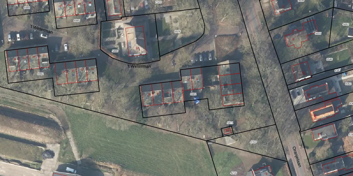 Het perceel waarop 't Weterman 7 staat heeft een oppervlakte van 1165 m². Dit is een zeer groot perceel. De perceeloppervlakte wordt geregistreerd door het Kadaster. Gedetailleerde informatie over de maten van dit perceel kunt u vinden in het rapport Kadastrale kaart met maatvoering van 't Weterman 7.