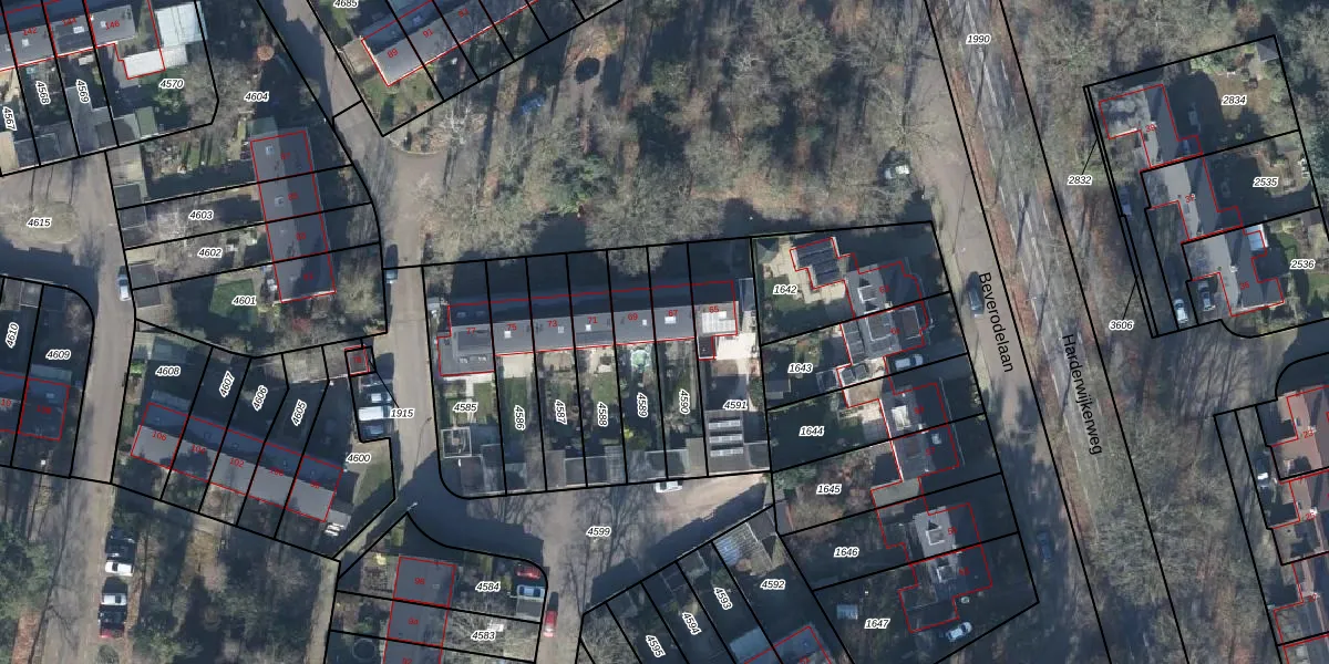 Beverodelaan 67 is gelegen op kadastraal perceel DRN00P4590. Deze kadastrale aanduiding is uniek en wordt gebruikt door het Kadaster om eigendomsrechten en andere zakelijke rechten vast te leggen. Het perceel maakt onderdeel uit van de kadastrale gemeente Dieren.