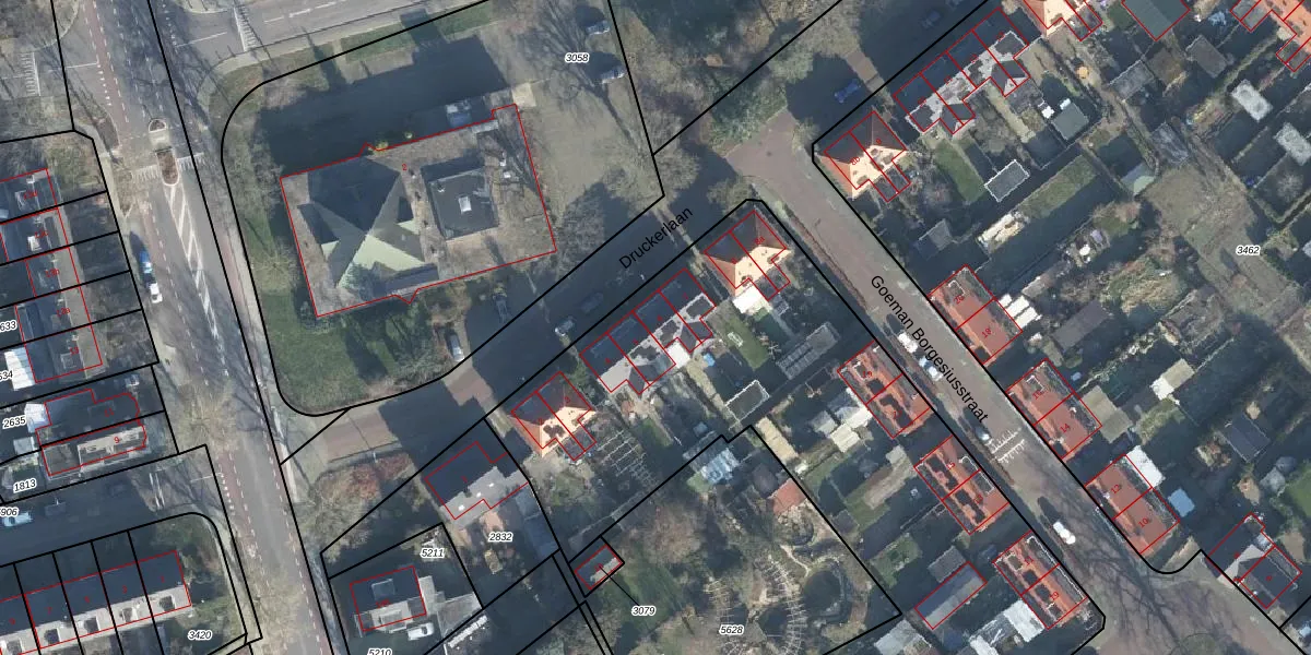 Het perceel waarop Druckerlaan 6 staat heeft een oppervlakte van 4816 m². Dit is een zeer groot perceel. De perceeloppervlakte wordt geregistreerd door het Kadaster. Gedetailleerde informatie over de maten van dit perceel kunt u vinden in het rapport Kadastrale kaart met maatvoering van Druckerlaan 6.
