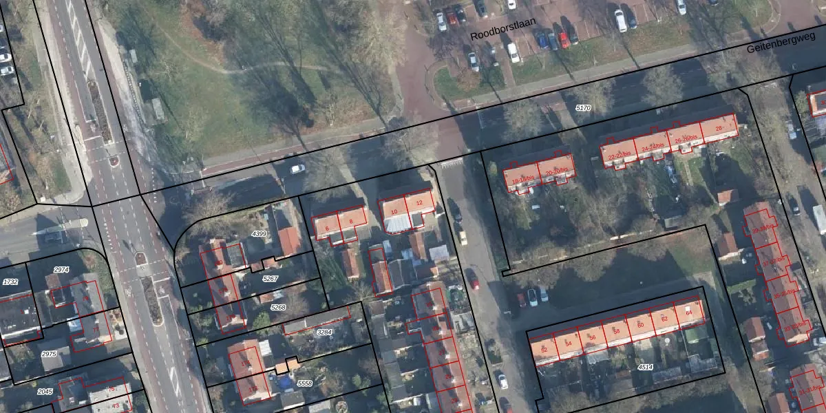Het perceel waarop Geitenbergweg 12 staat heeft een oppervlakte van 4305 m². Dit is een zeer groot perceel. De perceeloppervlakte wordt geregistreerd door het Kadaster. Gedetailleerde informatie over de maten van dit perceel kunt u vinden in het rapport Kadastrale kaart met maatvoering van Geitenbergweg 12.