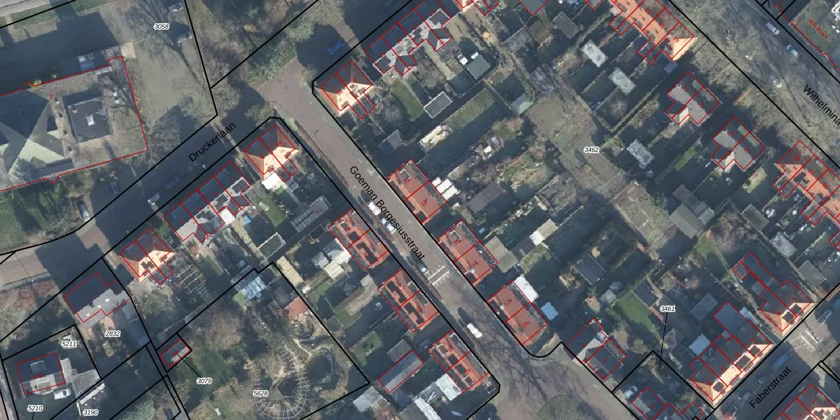Het perceel waarop Goeman Borgesiusstraat 18 staat heeft een oppervlakte van 9101 m². Dit is een zeer groot perceel. De perceeloppervlakte wordt geregistreerd door het Kadaster. Gedetailleerde informatie over de maten van dit perceel kunt u vinden in het rapport Kadastrale kaart met maatvoering van Goeman Borgesiusstraat 18.