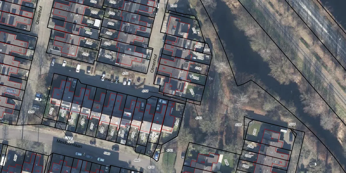 Het perceel waarop Olmenhof 48 staat heeft een oppervlakte van 265 m². Dit is een middelgroot perceel. De perceeloppervlakte wordt geregistreerd door het Kadaster. Gedetailleerde informatie over de maten van dit perceel kunt u vinden in het rapport Kadastrale kaart met maatvoering van Olmenhof 48.