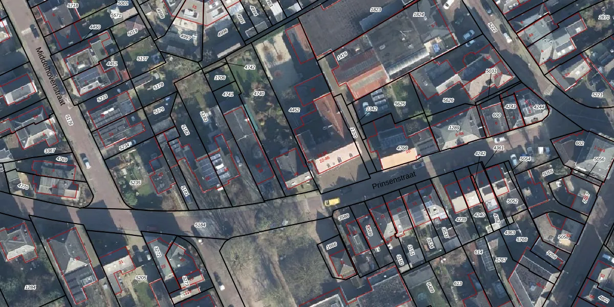 Het perceel waarop Prinsenstraat 24 staat heeft een oppervlakte van 965 m². Dit is een groot perceel. De perceeloppervlakte wordt geregistreerd door het Kadaster. Gedetailleerde informatie over de maten van dit perceel kunt u vinden in het rapport Kadastrale kaart met maatvoering van Prinsenstraat 24.