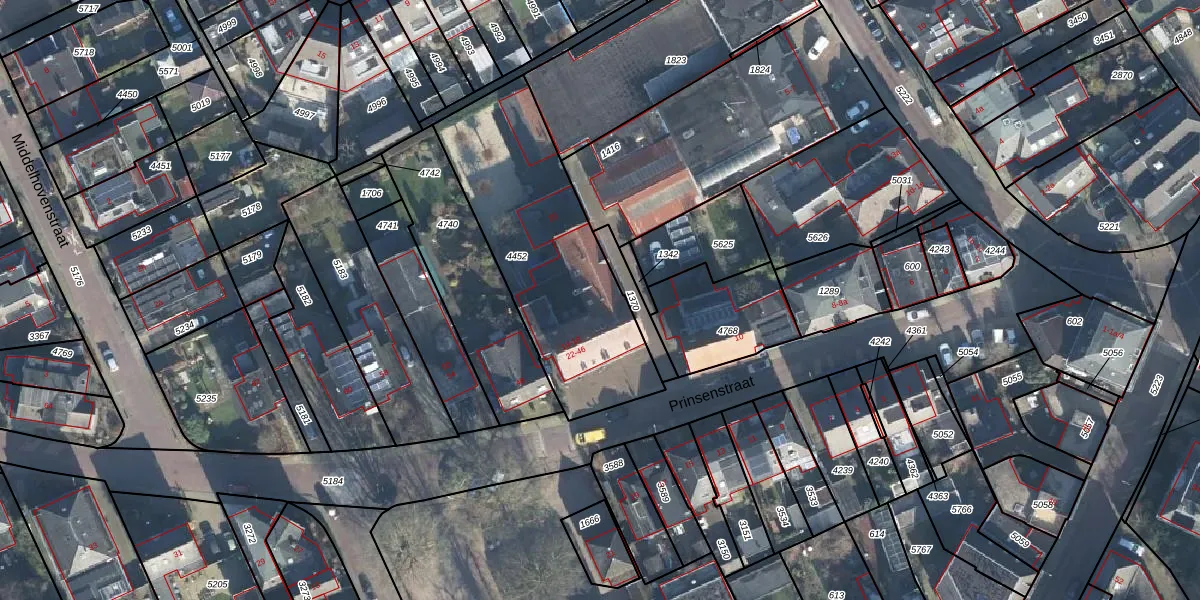 Het perceel waarop Prinsenstraat 36 staat heeft een oppervlakte van 965 m². Dit is een groot perceel. De perceeloppervlakte wordt geregistreerd door het Kadaster. Gedetailleerde informatie over de maten van dit perceel kunt u vinden in het rapport Kadastrale kaart met maatvoering van Prinsenstraat 36.