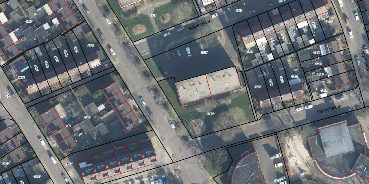 Het perceel waarop Willaertlaan 39 staat heeft een oppervlakte van 1305 m². Dit is een zeer groot perceel. De perceeloppervlakte wordt geregistreerd door het Kadaster. Gedetailleerde informatie over de maten van dit perceel kunt u vinden in het rapport Kadastrale kaart met maatvoering van Willaertlaan 39.