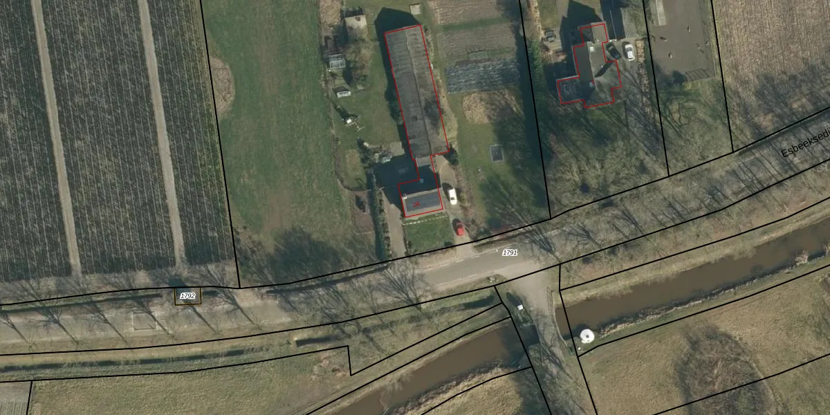 Het perceel waarop Esbeeksedijk 2-A staat heeft een oppervlakte van 1,2 ha. Dit is een zeer groot perceel. De perceeloppervlakte wordt geregistreerd door het Kadaster. Gedetailleerde informatie over de maten van dit perceel kunt u vinden in het rapport Kadastrale kaart met maatvoering van Esbeeksedijk 2-A.