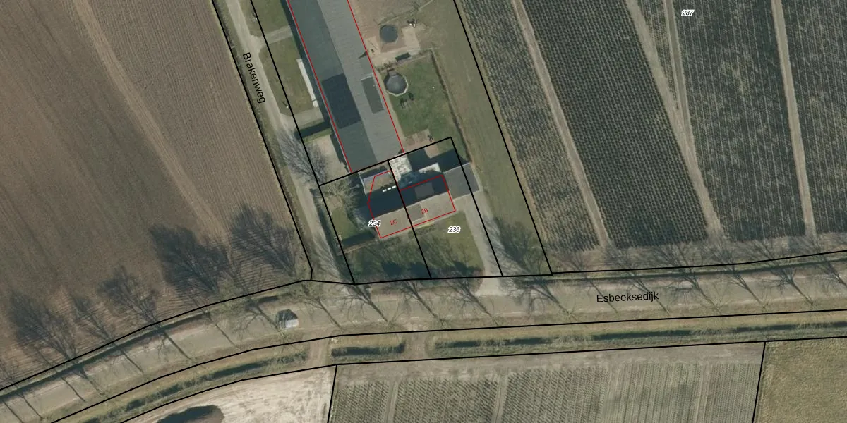 Het perceel waarop Esbeeksedijk 2-B staat heeft een oppervlakte van 519 m². Dit is een groot perceel. De perceeloppervlakte wordt geregistreerd door het Kadaster. Gedetailleerde informatie over de maten van dit perceel kunt u vinden in het rapport Kadastrale kaart met maatvoering van Esbeeksedijk 2-B.