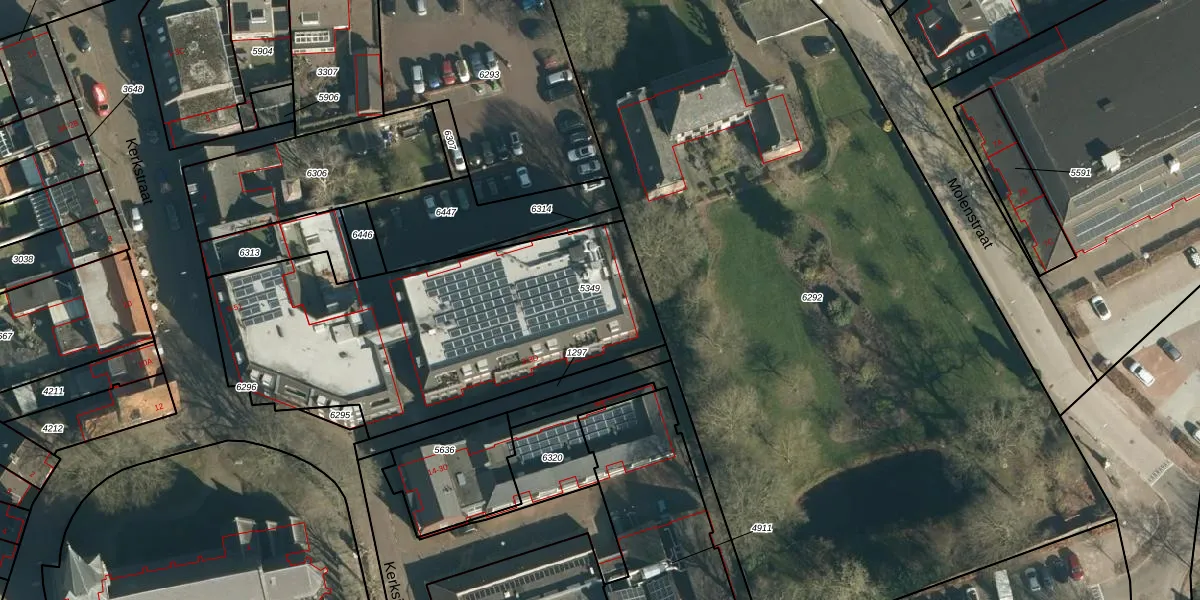 Het perceel waarop Kerkstraat 45 staat heeft een oppervlakte van 1727 m². Dit is een zeer groot perceel. De perceeloppervlakte wordt geregistreerd door het Kadaster. Gedetailleerde informatie over de maten van dit perceel kunt u vinden in het rapport Kadastrale kaart met maatvoering van Kerkstraat 45.