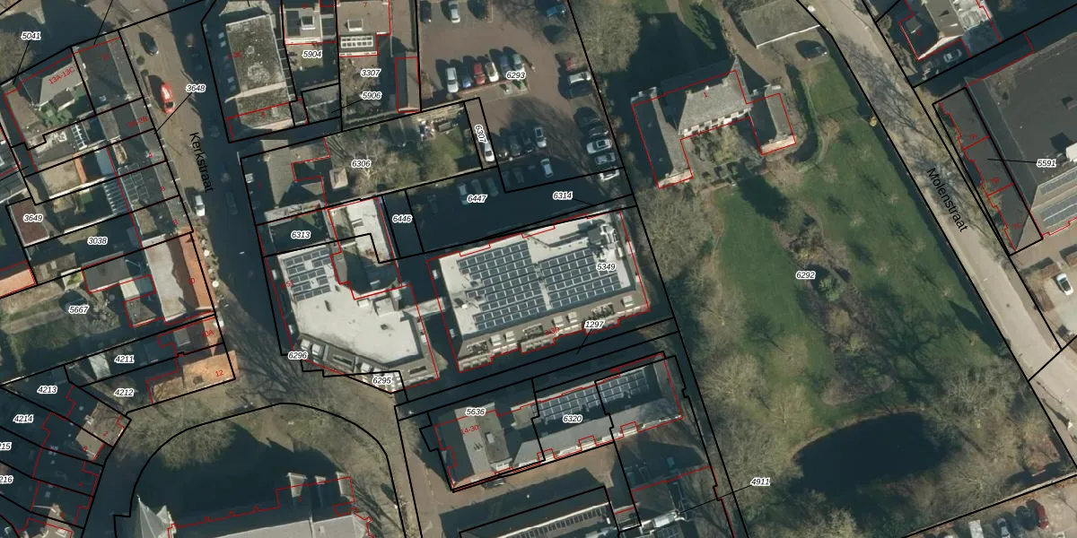 Het perceel waarop Kerkstraat 49 staat heeft een oppervlakte van 1727 m². Dit is een zeer groot perceel. De perceeloppervlakte wordt geregistreerd door het Kadaster. Gedetailleerde informatie over de maten van dit perceel kunt u vinden in het rapport Kadastrale kaart met maatvoering van Kerkstraat 49.