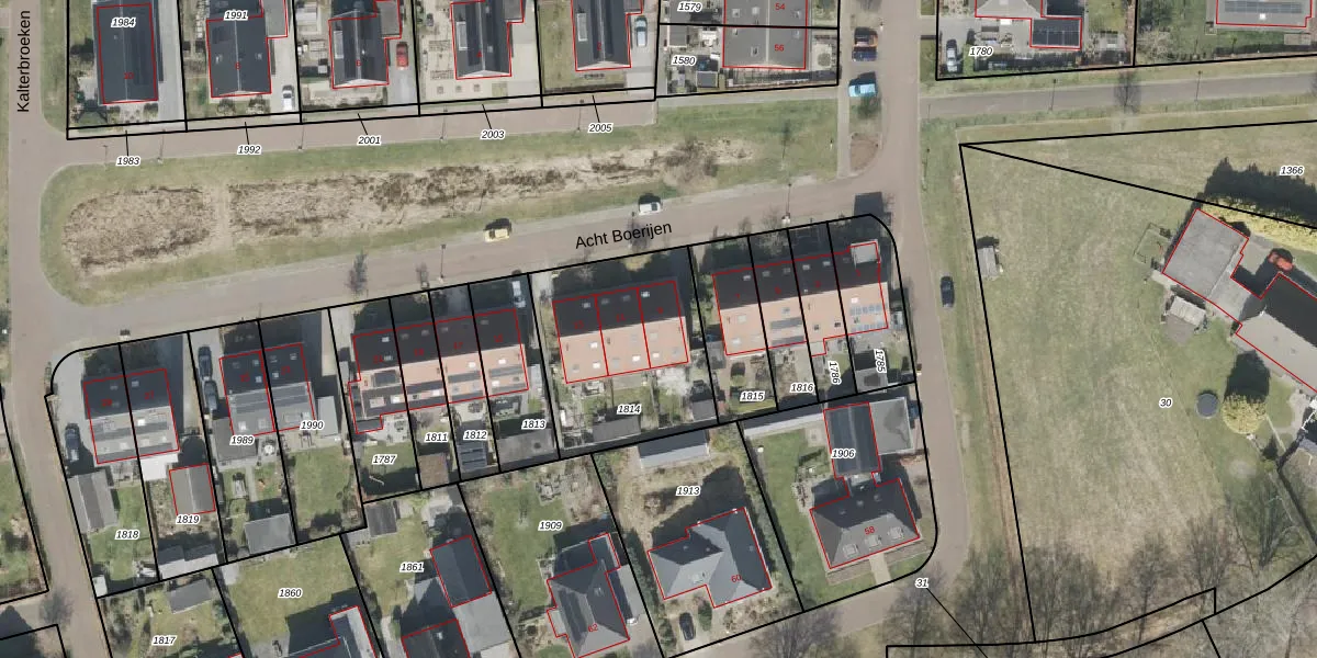Het perceel waarop Acht Boerijen 9 staat heeft een oppervlakte van 695 m². Dit is een groot perceel. De perceeloppervlakte wordt geregistreerd door het Kadaster. Gedetailleerde informatie over de maten van dit perceel kunt u vinden in het rapport Kadastrale kaart met maatvoering van Acht Boerijen 9.