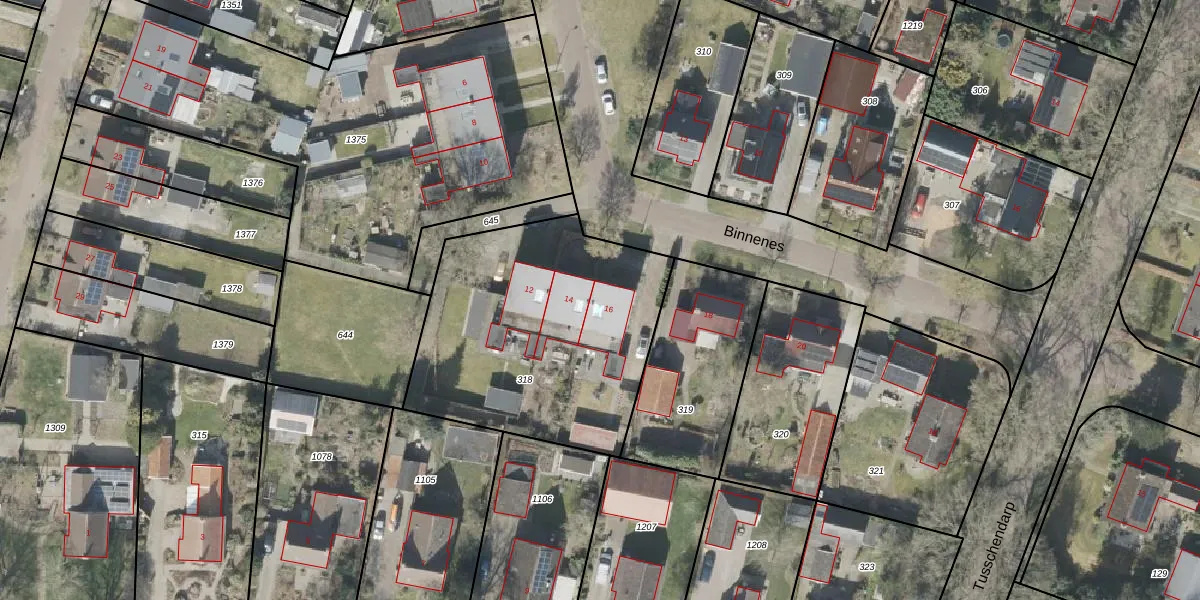 Het perceel waarop Binnenes 16 staat heeft een oppervlakte van 1291 m². Dit is een zeer groot perceel. De perceeloppervlakte wordt geregistreerd door het Kadaster. Gedetailleerde informatie over de maten van dit perceel kunt u vinden in het rapport Kadastrale kaart met maatvoering van Binnenes 16.