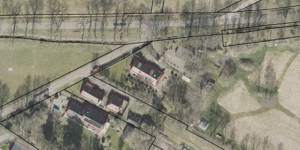 Het perceel waarop het adres ligt is DVR00-I-173. De afkorting 'DVR00' staat voor kadastrale gemeente Diever. Het perceel is 1,4 ha groot. Dat is kleiner dan de gemiddelde perceeloppervlakte in Diever, dat op 1,4 ha ligt. Het grootste perceel in de kadastrale gemeente is 8,16 km². Het kleinste perceel heeft een oppervlakte van 0 m². Er zijn 2 adressen aanwezig op het perceel. De huidige grenzen van het perceel zijn digitaal in de Basisregistratie Kadaster (BRK) geregistreerd op 16-09-2002.
