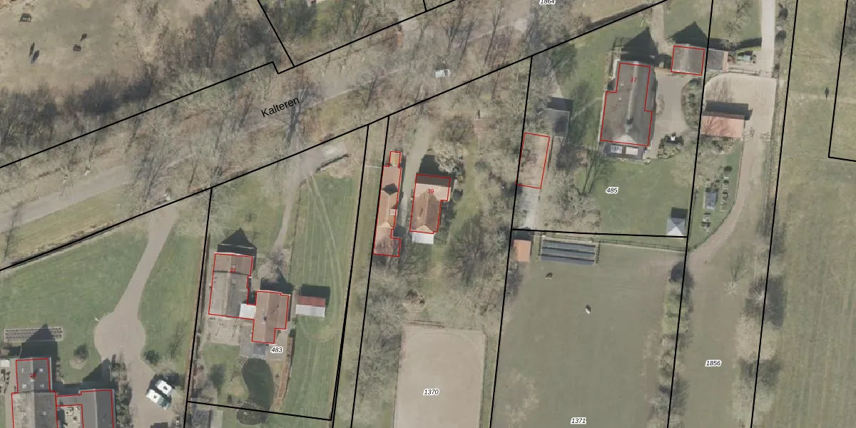 Het perceel waarop Kalteren 19 staat heeft een oppervlakte van 3468 m². Dit is een zeer groot perceel. De perceeloppervlakte wordt geregistreerd door het Kadaster. Gedetailleerde informatie over de maten van dit perceel kunt u vinden in het rapport Kadastrale kaart met maatvoering van Kalteren 19.