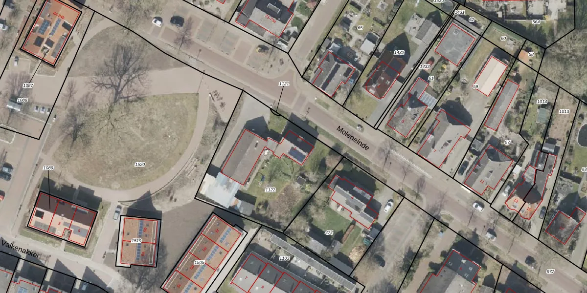 Het perceel waarop Moleneinde 2 staat heeft een oppervlakte van 1351 m². Dit is een zeer groot perceel. De perceeloppervlakte wordt geregistreerd door het Kadaster. Gedetailleerde informatie over de maten van dit perceel kunt u vinden in het rapport Kadastrale kaart met maatvoering van Moleneinde 2.