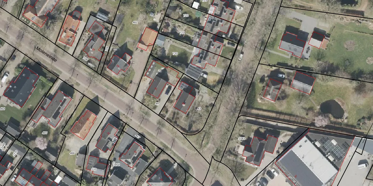 Het perceel waarop Moleneinde 33 staat heeft een oppervlakte van 627 m². Dit is een groot perceel. De perceeloppervlakte wordt geregistreerd door het Kadaster. Gedetailleerde informatie over de maten van dit perceel kunt u vinden in het rapport Kadastrale kaart met maatvoering van Moleneinde 33.