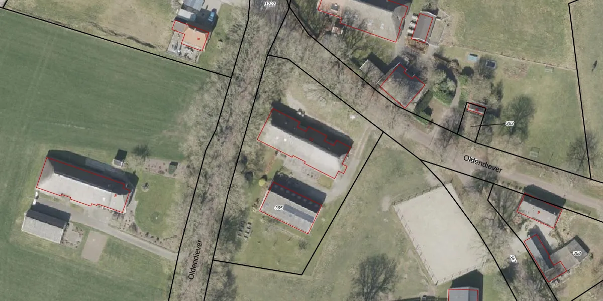 Het perceel waarop Oldendiever 11 staat heeft een oppervlakte van 2390 m². Dit is een zeer groot perceel. De perceeloppervlakte wordt geregistreerd door het Kadaster. Gedetailleerde informatie over de maten van dit perceel kunt u vinden in het rapport Kadastrale kaart met maatvoering van Oldendiever 11.