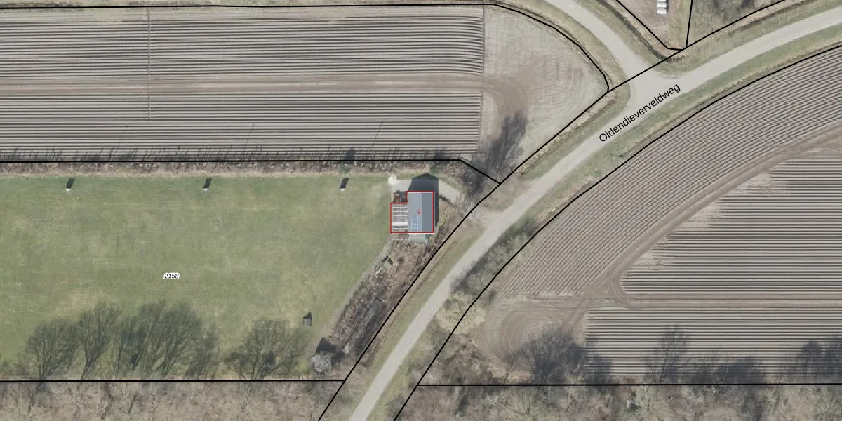 Oldendieverveldweg 2 is gelegen op kadastraal perceel DVR00I2158. Deze kadastrale aanduiding is uniek en wordt gebruikt door het Kadaster om eigendomsrechten en andere zakelijke rechten vast te leggen. Het perceel maakt onderdeel uit van de kadastrale gemeente Diever.