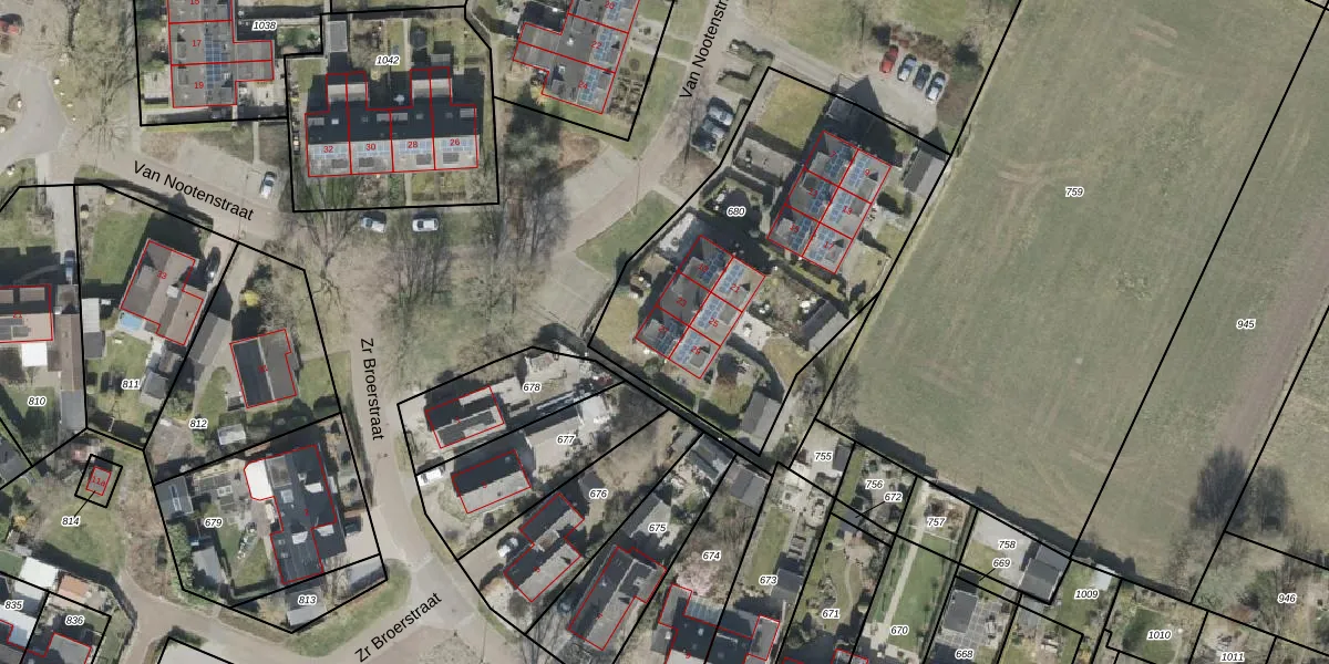 Het perceel waarop Van Nootenstraat 27 staat heeft een oppervlakte van 1599 m². Dit is een zeer groot perceel. De perceeloppervlakte wordt geregistreerd door het Kadaster. Gedetailleerde informatie over de maten van dit perceel kunt u vinden in het rapport Kadastrale kaart met maatvoering van Van Nootenstraat 27.