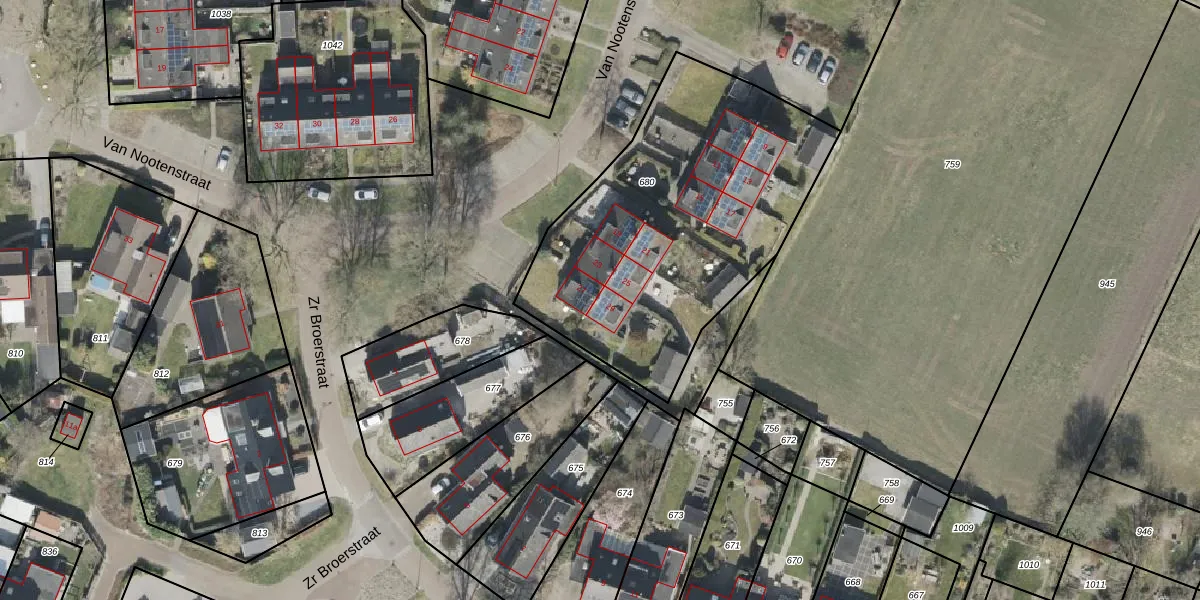 Het perceel waarop Van Nootenstraat 29 staat heeft een oppervlakte van 1599 m². Dit is een zeer groot perceel. De perceeloppervlakte wordt geregistreerd door het Kadaster. Gedetailleerde informatie over de maten van dit perceel kunt u vinden in het rapport Kadastrale kaart met maatvoering van Van Nootenstraat 29.