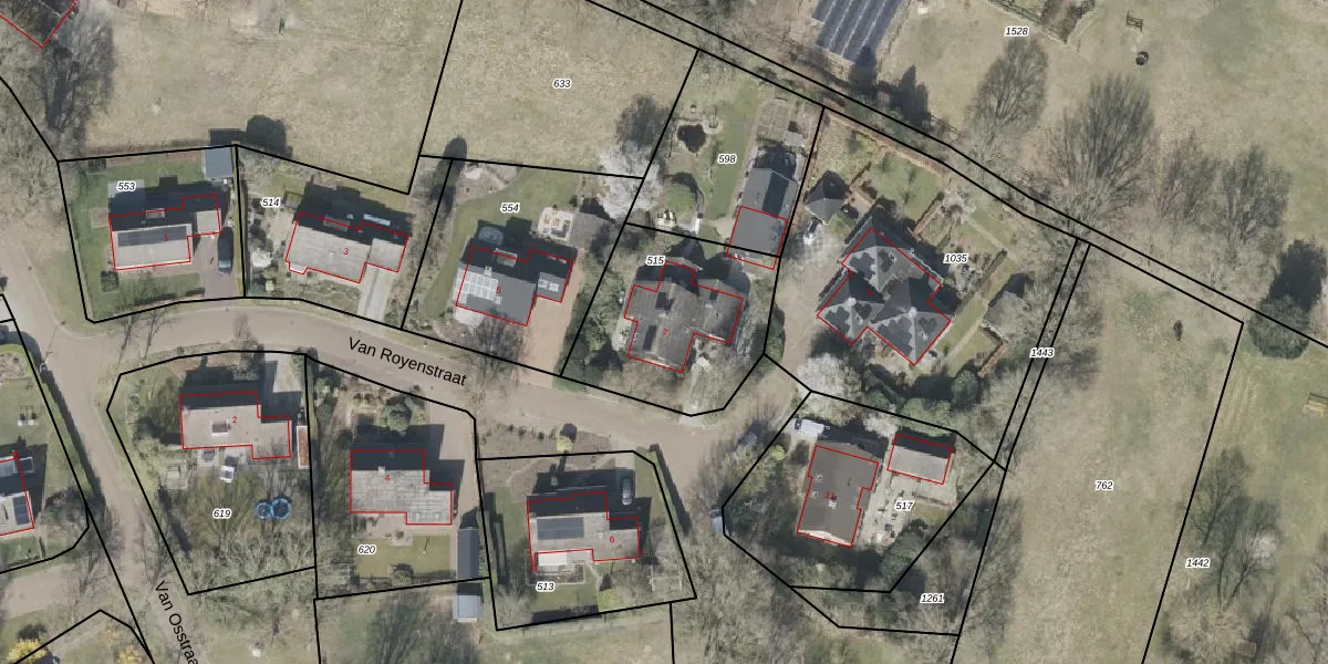 Van Royenstraat 7 is gelegen op kadastraal perceel DVR00G515. Deze kadastrale aanduiding is uniek en wordt gebruikt door het Kadaster om eigendomsrechten en andere zakelijke rechten vast te leggen. Het perceel maakt onderdeel uit van de kadastrale gemeente Diever.