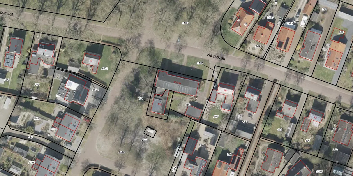 Het perceel waarop Vlasstraat 10 staat heeft een oppervlakte van 605 m². Dit is een groot perceel. De perceeloppervlakte wordt geregistreerd door het Kadaster. Gedetailleerde informatie over de maten van dit perceel kunt u vinden in het rapport Kadastrale kaart met maatvoering van Vlasstraat 10.