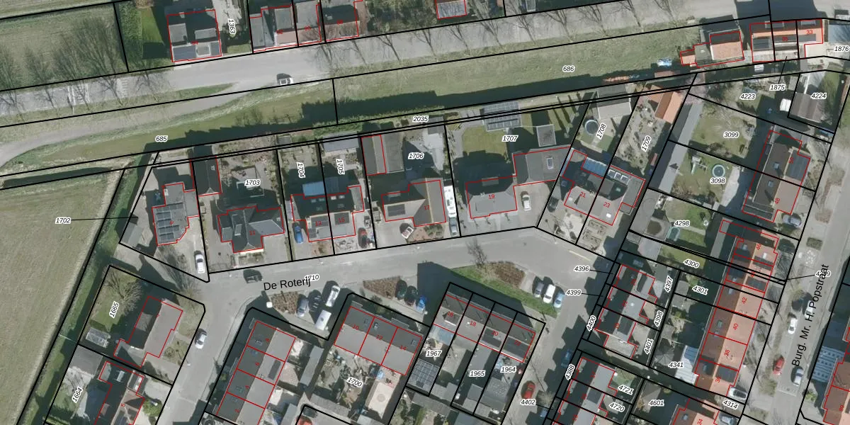 Het perceel waarop De Roterij 17 staat heeft een oppervlakte van 534 m². Dit is een groot perceel. De perceeloppervlakte wordt geregistreerd door het Kadaster. Gedetailleerde informatie over de maten van dit perceel kunt u vinden in het rapport Kadastrale kaart met maatvoering van De Roterij 17.