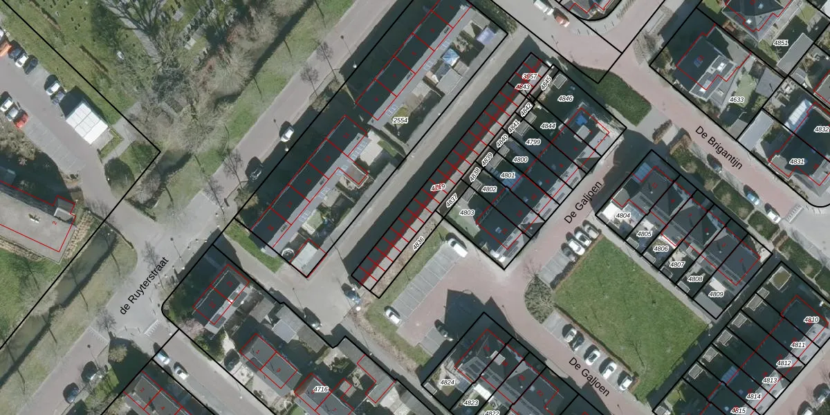 Het perceel waarop de Ruyterstraat 19-h-G staat heeft een oppervlakte van 355 m². Dit is een groot perceel. De perceeloppervlakte wordt geregistreerd door het Kadaster. Gedetailleerde informatie over de maten van dit perceel kunt u vinden in het rapport Kadastrale kaart met maatvoering van de Ruyterstraat 19-h-G.
