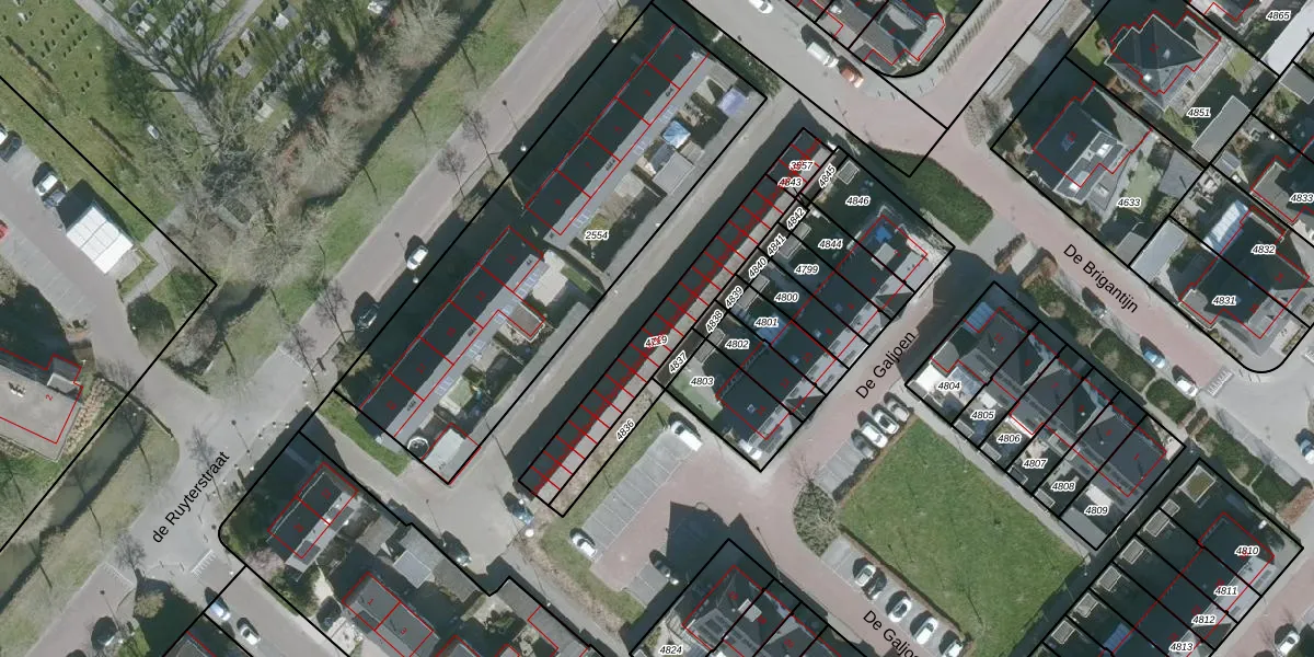 Het perceel waarop de Ruyterstraat 19-k-G staat heeft een oppervlakte van 355 m². Dit is een groot perceel. De perceeloppervlakte wordt geregistreerd door het Kadaster. Gedetailleerde informatie over de maten van dit perceel kunt u vinden in het rapport Kadastrale kaart met maatvoering van de Ruyterstraat 19-k-G.