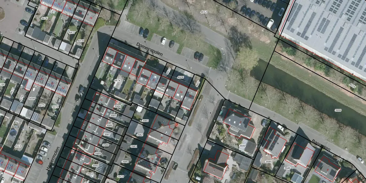 Het perceel waarop Domeinmolen 18 staat heeft een oppervlakte van 303 m². Dit is een groot perceel. De perceeloppervlakte wordt geregistreerd door het Kadaster. Gedetailleerde informatie over de maten van dit perceel kunt u vinden in het rapport Kadastrale kaart met maatvoering van Domeinmolen 18.