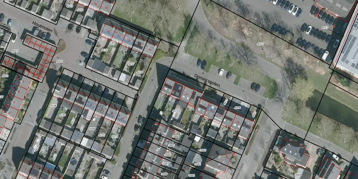 Het perceel waarop Domeinmolen 4 staat heeft een oppervlakte van 977 m². Dit is een groot perceel. De perceeloppervlakte wordt geregistreerd door het Kadaster. Gedetailleerde informatie over de maten van dit perceel kunt u vinden in het rapport Kadastrale kaart met maatvoering van Domeinmolen 4.
