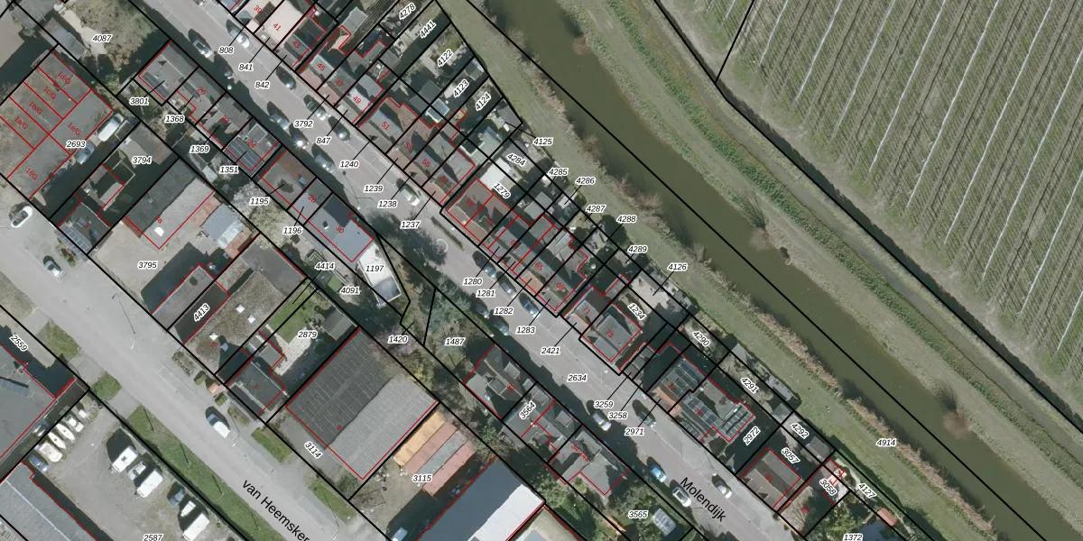 Het perceel waarop Molendijk 65 staat heeft een oppervlakte van 64 m². Dit is een klein perceel. De perceeloppervlakte wordt geregistreerd door het Kadaster. Gedetailleerde informatie over de maten van dit perceel kunt u vinden in het rapport Kadastrale kaart met maatvoering van Molendijk 65.