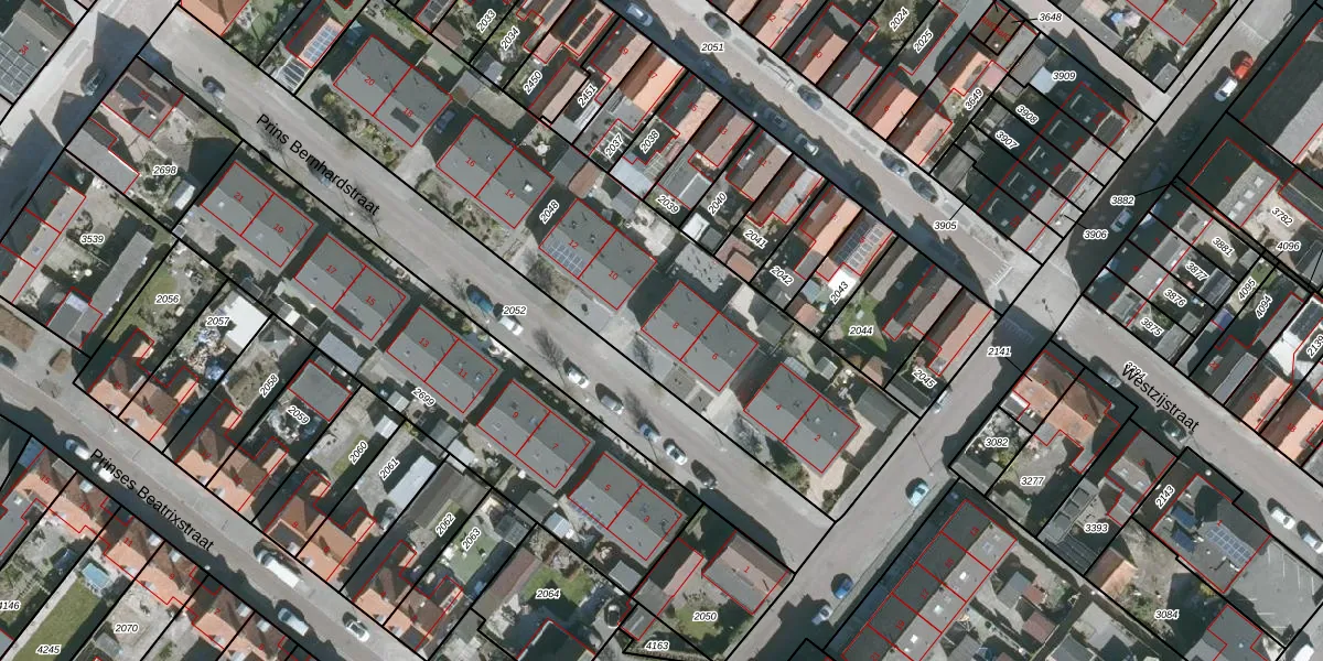 Het perceel waarop Prins Bernhardstraat 8 staat heeft een oppervlakte van 2056 m². Dit is een zeer groot perceel. De perceeloppervlakte wordt geregistreerd door het Kadaster. Gedetailleerde informatie over de maten van dit perceel kunt u vinden in het rapport Kadastrale kaart met maatvoering van Prins Bernhardstraat 8.
