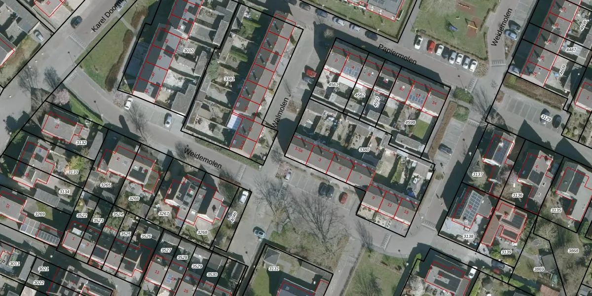Het perceel waarop Weidemolen 1-a staat heeft een oppervlakte van 1120 m². Dit is een zeer groot perceel. De perceeloppervlakte wordt geregistreerd door het Kadaster. Gedetailleerde informatie over de maten van dit perceel kunt u vinden in het rapport Kadastrale kaart met maatvoering van Weidemolen 1-a.