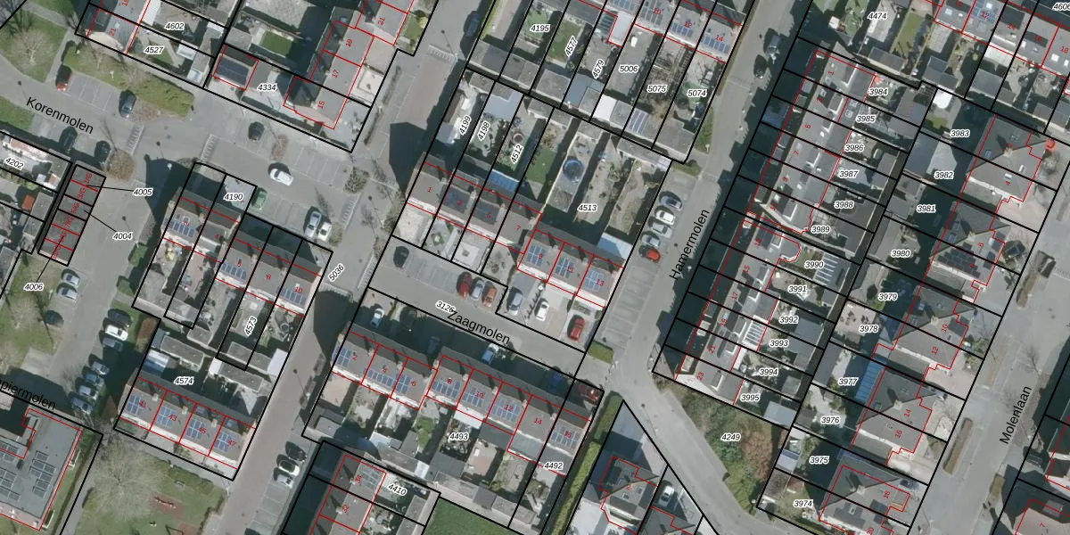 Het perceel waarop Zaagmolen 9 staat heeft een oppervlakte van 935 m². Dit is een groot perceel. De perceeloppervlakte wordt geregistreerd door het Kadaster. Gedetailleerde informatie over de maten van dit perceel kunt u vinden in het rapport Kadastrale kaart met maatvoering van Zaagmolen 9.