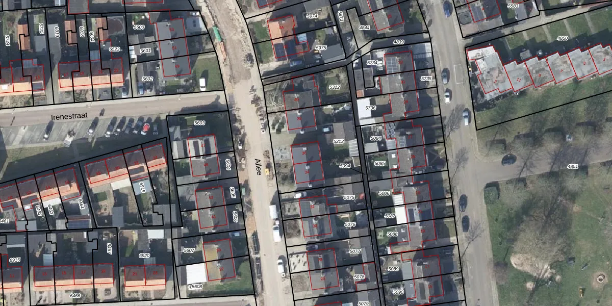 Het perceel waarop Allee 36 staat heeft een oppervlakte van 735 m². Dit is een groot perceel. De perceeloppervlakte wordt geregistreerd door het Kadaster. Gedetailleerde informatie over de maten van dit perceel kunt u vinden in het rapport Kadastrale kaart met maatvoering van Allee 36.