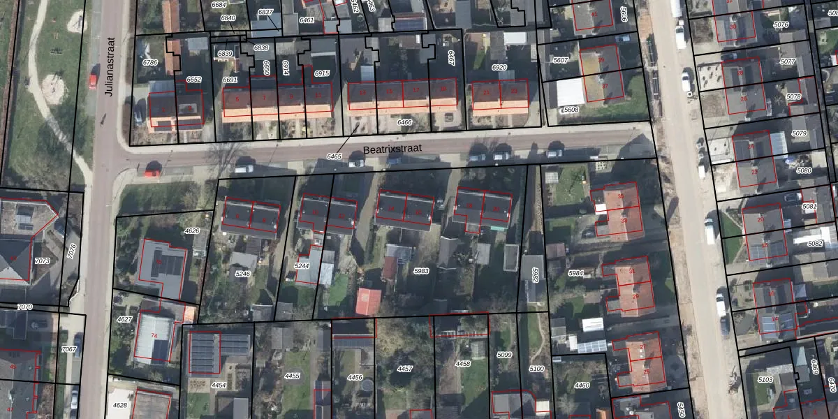Het perceel waarop Beatrixstraat 16 staat heeft een oppervlakte van 1620 m². Dit is een zeer groot perceel. De perceeloppervlakte wordt geregistreerd door het Kadaster. Gedetailleerde informatie over de maten van dit perceel kunt u vinden in het rapport Kadastrale kaart met maatvoering van Beatrixstraat 16.