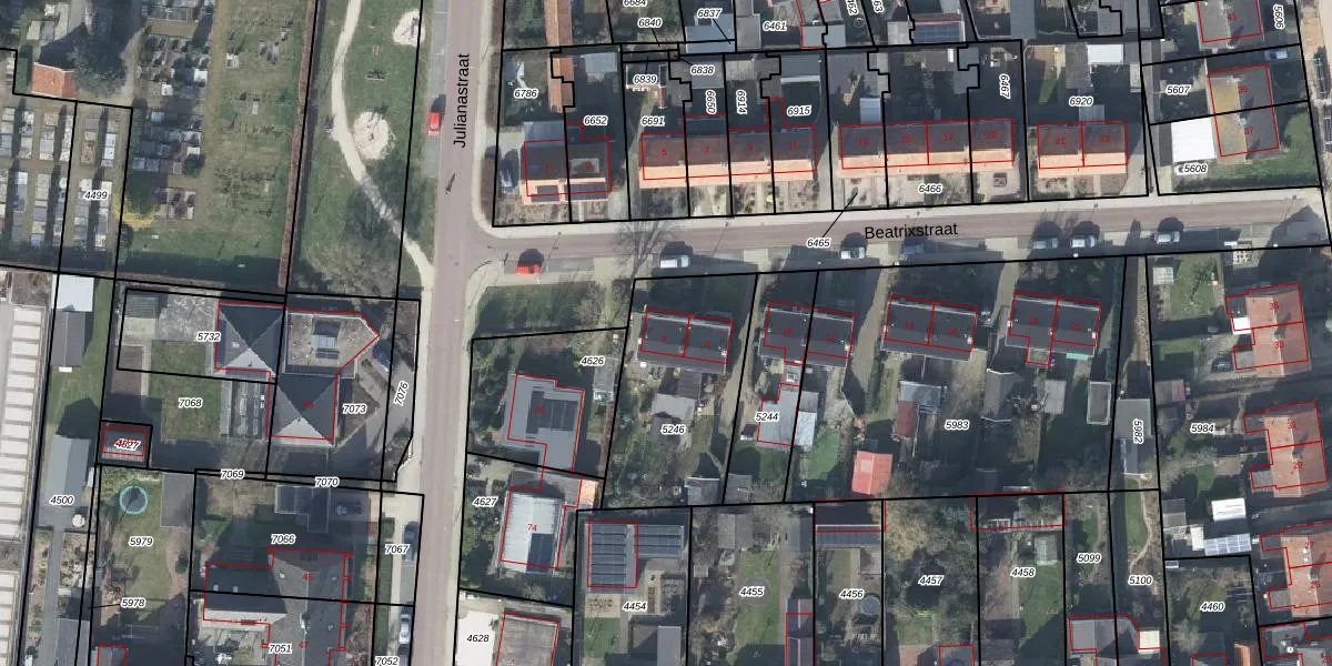 Het perceel waarop Beatrixstraat 6 staat heeft een oppervlakte van 622 m². Dit is een groot perceel. De perceeloppervlakte wordt geregistreerd door het Kadaster. Gedetailleerde informatie over de maten van dit perceel kunt u vinden in het rapport Kadastrale kaart met maatvoering van Beatrixstraat 6.