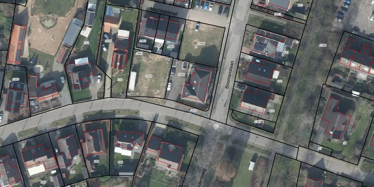 Het perceel waarop Bosmanslaan 1-B staat heeft een oppervlakte van 555 m². Dit is een groot perceel. De perceeloppervlakte wordt geregistreerd door het Kadaster. Gedetailleerde informatie over de maten van dit perceel kunt u vinden in het rapport Kadastrale kaart met maatvoering van Bosmanslaan 1-B.