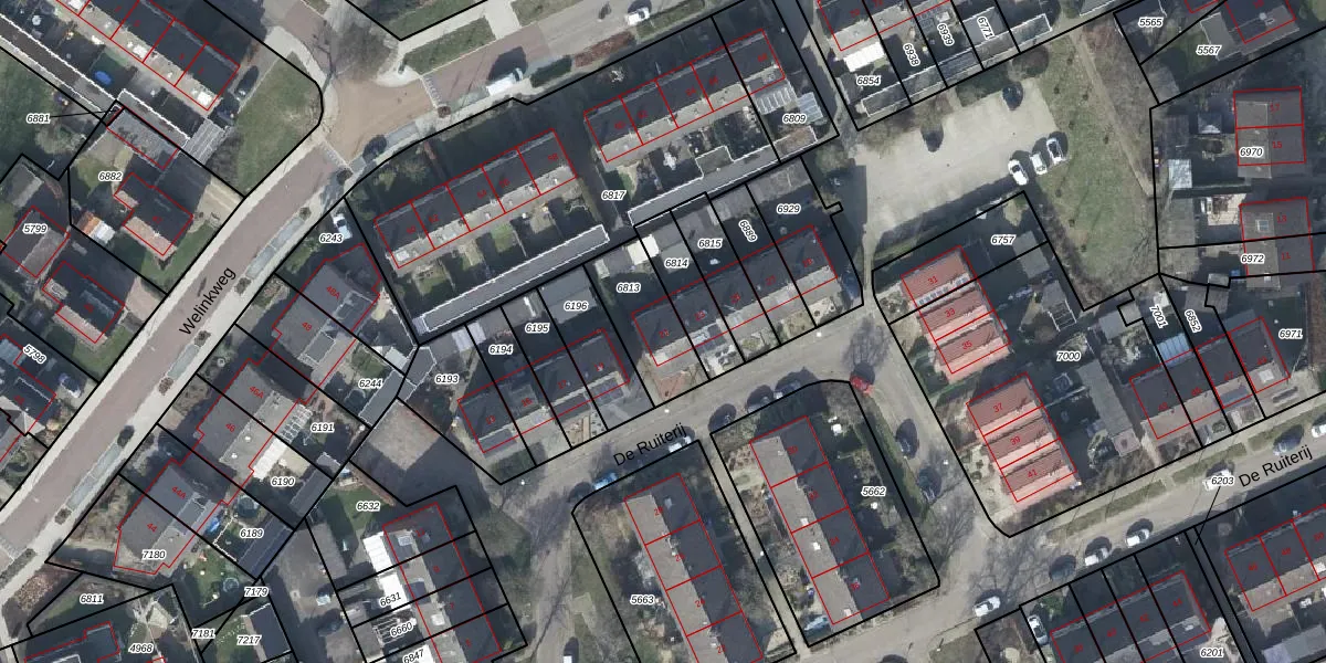 Het perceel waarop De Ruiterij 21 staat heeft een oppervlakte van 227 m². Dit is een middelgroot perceel. De perceeloppervlakte wordt geregistreerd door het Kadaster. Gedetailleerde informatie over de maten van dit perceel kunt u vinden in het rapport Kadastrale kaart met maatvoering van De Ruiterij 21.