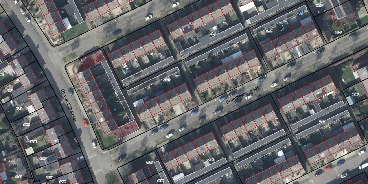 Het perceel waarop Eisenhowerstraat 9 staat heeft een oppervlakte van 3215 m². Dit is een zeer groot perceel. De perceeloppervlakte wordt geregistreerd door het Kadaster. Gedetailleerde informatie over de maten van dit perceel kunt u vinden in het rapport Kadastrale kaart met maatvoering van Eisenhowerstraat 9.