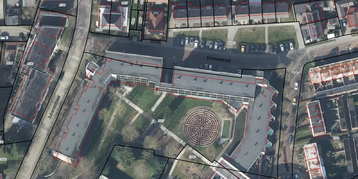 Het perceel waarop Emmastraat 46 staat heeft een oppervlakte van 7023 m². Dit is een zeer groot perceel. De perceeloppervlakte wordt geregistreerd door het Kadaster. Gedetailleerde informatie over de maten van dit perceel kunt u vinden in het rapport Kadastrale kaart met maatvoering van Emmastraat 46.