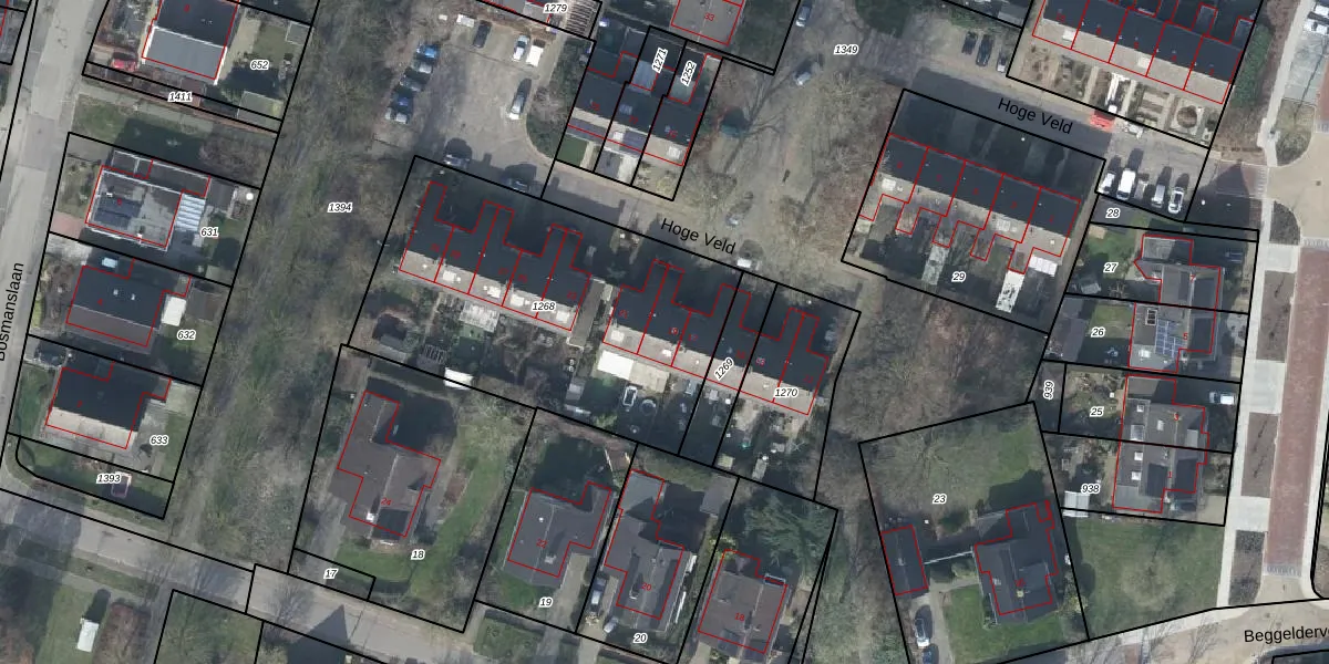 Het perceel waarop Hoge Veld 19 staat heeft een oppervlakte van 1568 m². Dit is een zeer groot perceel. De perceeloppervlakte wordt geregistreerd door het Kadaster. Gedetailleerde informatie over de maten van dit perceel kunt u vinden in het rapport Kadastrale kaart met maatvoering van Hoge Veld 19.