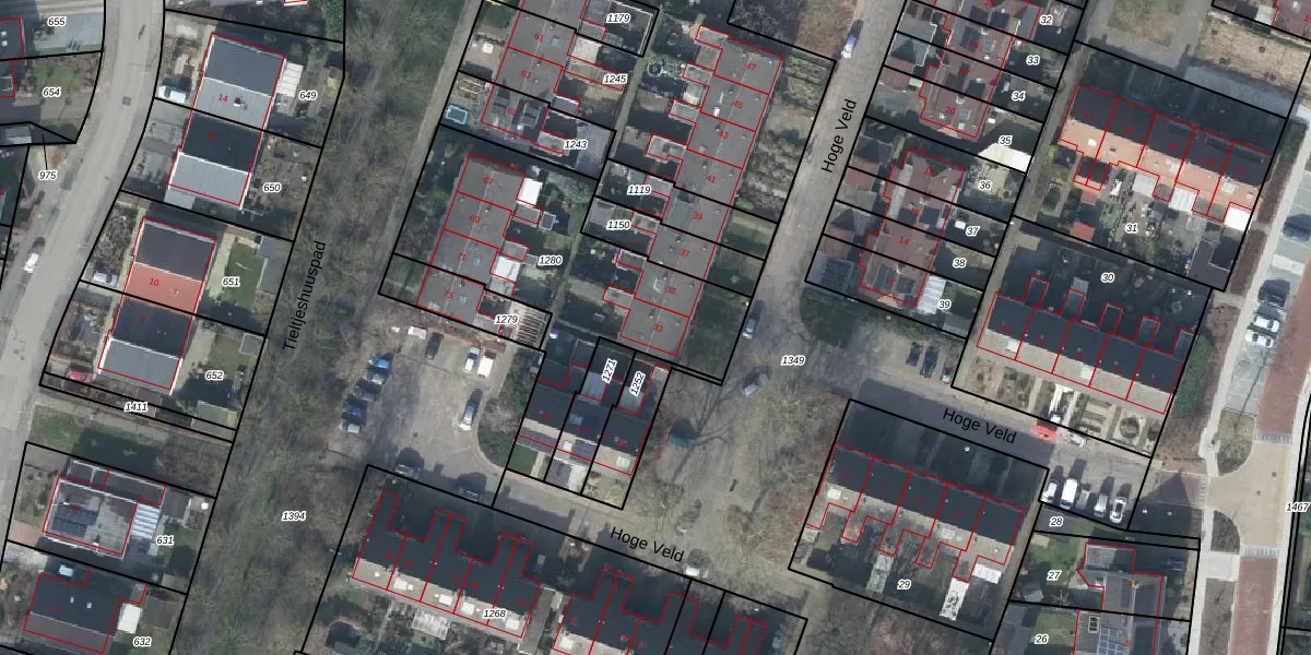 Het perceel waarop Hoge Veld 33 staat heeft een oppervlakte van 1090 m². Dit is een zeer groot perceel. De perceeloppervlakte wordt geregistreerd door het Kadaster. Gedetailleerde informatie over de maten van dit perceel kunt u vinden in het rapport Kadastrale kaart met maatvoering van Hoge Veld 33.