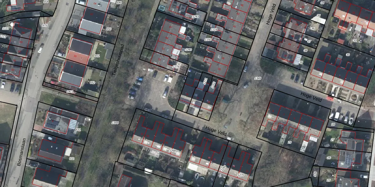 Het perceel waarop Hoge Veld 75 staat heeft een oppervlakte van 1090 m². Dit is een zeer groot perceel. De perceeloppervlakte wordt geregistreerd door het Kadaster. Gedetailleerde informatie over de maten van dit perceel kunt u vinden in het rapport Kadastrale kaart met maatvoering van Hoge Veld 75.
