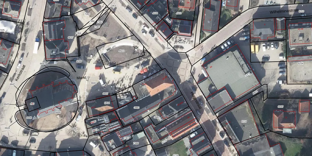 Het perceel waarop Markt 1-V staat heeft een oppervlakte van 733 m². Dit is een groot perceel. De perceeloppervlakte wordt geregistreerd door het Kadaster. Gedetailleerde informatie over de maten van dit perceel kunt u vinden in het rapport Kadastrale kaart met maatvoering van Markt 1-V.