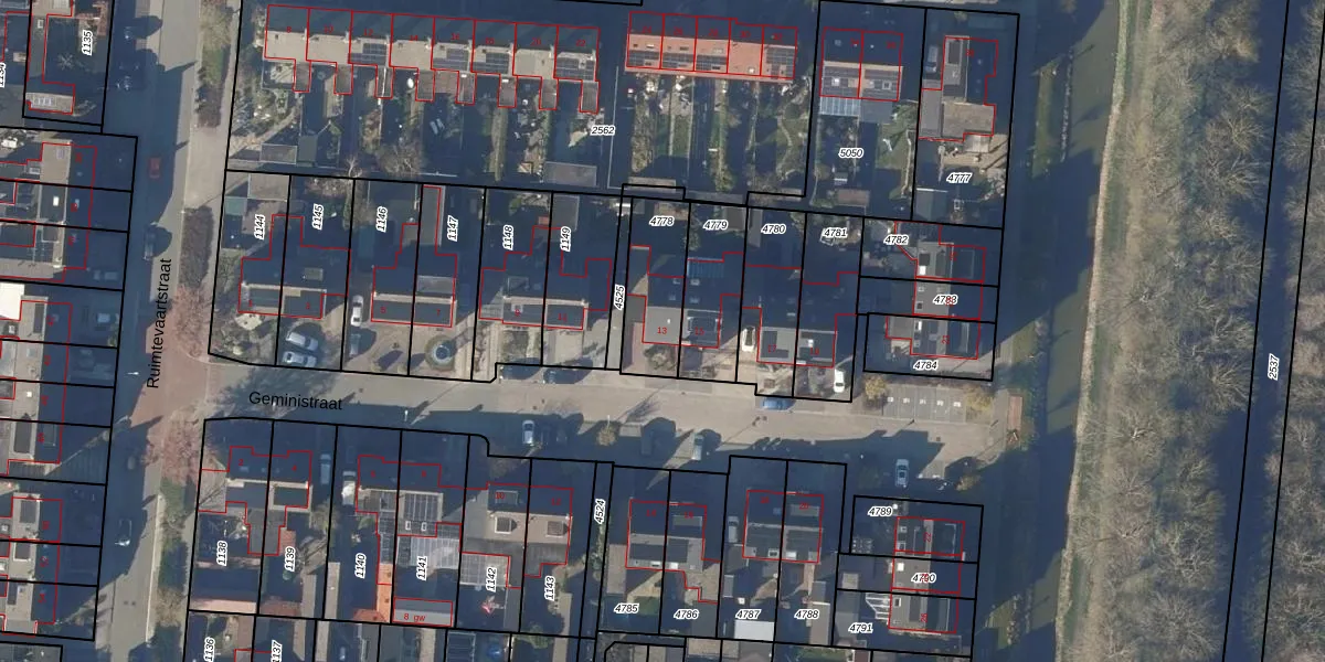 Het perceel waarop Geministraat 13 staat heeft een oppervlakte van 233 m². Dit is een middelgroot perceel. De perceeloppervlakte wordt geregistreerd door het Kadaster. Gedetailleerde informatie over de maten van dit perceel kunt u vinden in het rapport Kadastrale kaart met maatvoering van Geministraat 13.
