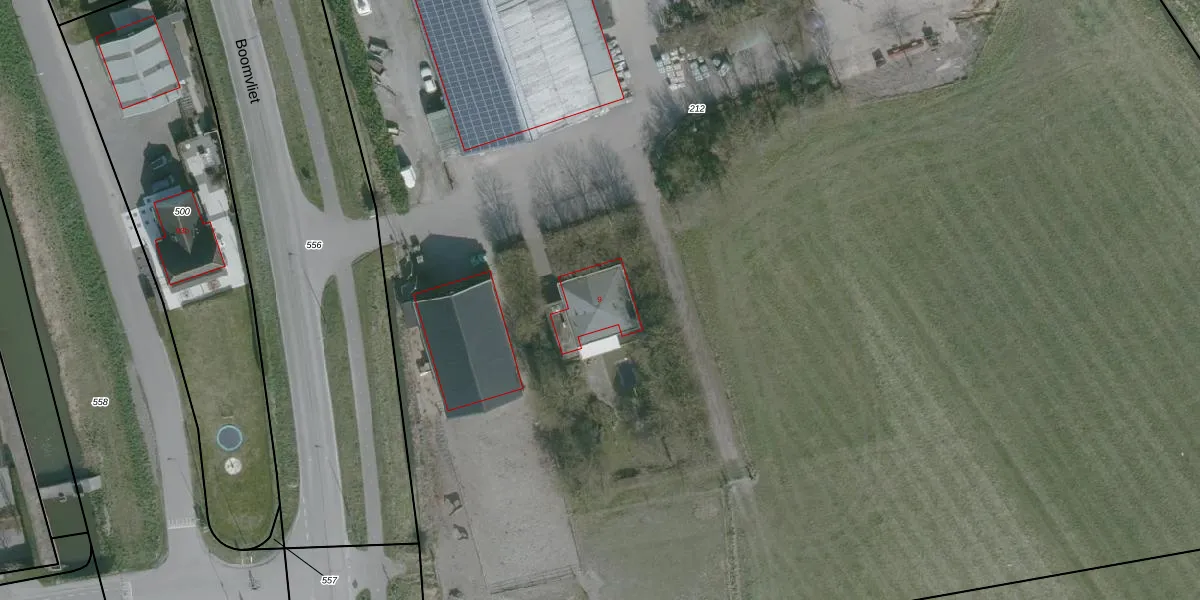 Het perceel waarop Boomvliet 9 staat heeft een oppervlakte van 2,4 ha. Dit is een zeer groot perceel. De perceeloppervlakte wordt geregistreerd door het Kadaster. Gedetailleerde informatie over de maten van dit perceel kunt u vinden in het rapport Kadastrale kaart met maatvoering van Boomvliet 9.
