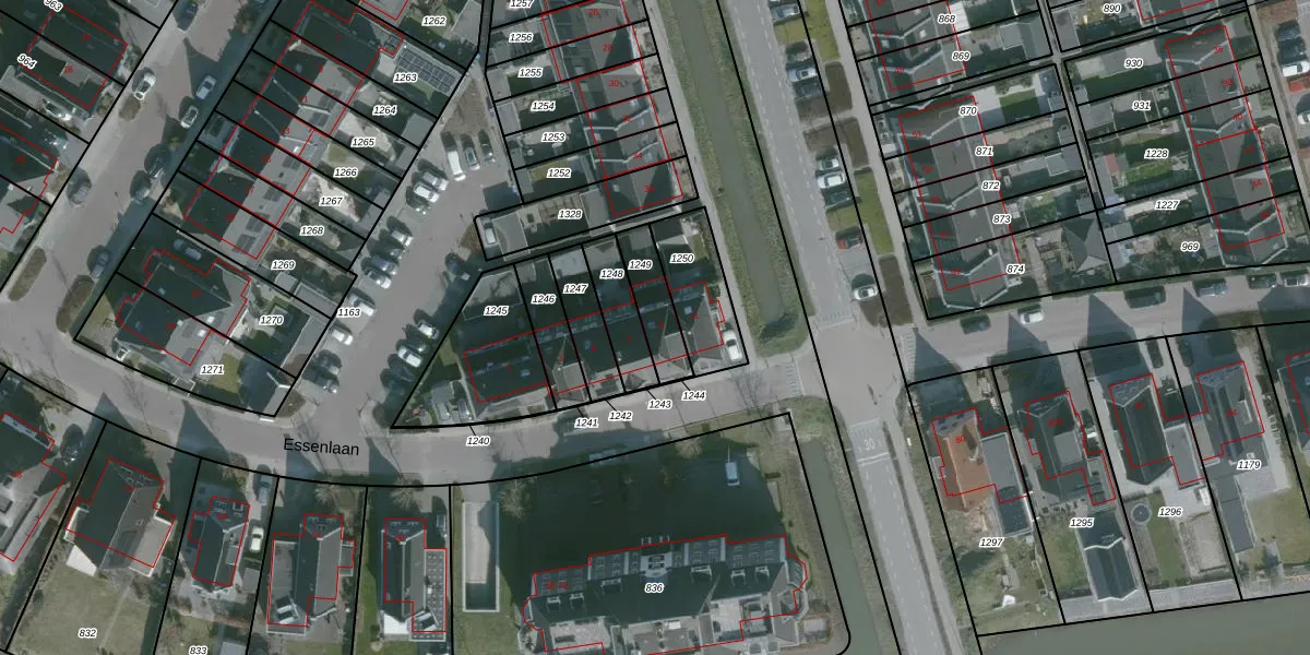 Essenlaan 9 is gelegen op kadastraal perceel DLD00G1249. Deze kadastrale aanduiding is uniek en wordt gebruikt door het Kadaster om eigendomsrechten en andere zakelijke rechten vast te leggen. Het perceel maakt onderdeel uit van de kadastrale gemeente Dirksland.