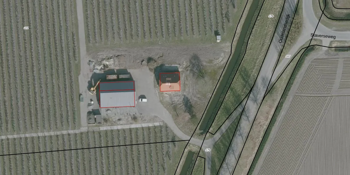 Het perceel waarop Oudelandsedijk 2 staat heeft een oppervlakte van 2,2 ha. Dit is een zeer groot perceel. De perceeloppervlakte wordt geregistreerd door het Kadaster. Gedetailleerde informatie over de maten van dit perceel kunt u vinden in het rapport Kadastrale kaart met maatvoering van Oudelandsedijk 2.