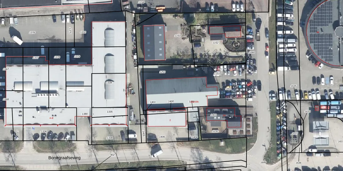 Het adres is gelegen op perceel 1402 in de sectie C en de kadastrale gemeente Dodewaard. De kadastrale aanduiding is aldus DDW00-C-1402. Het perceel is kleiner dan gemiddeld in Dodewaard. Het perceel is 1495 m² groot, terwijl het gemiddelde ligt op 4860 m². Het kleinste perceel in de kadastrale gemeente is 1 m² groot. De grootste perceeloppervlakte is 38,7 ha. Op het perceel zijn 3 adressen aanwezig. De huidige grenzen van het perceel zijn digitaal in de Basisregistratie Kadaster (BRK) geregistreerd op 27-09-2011.